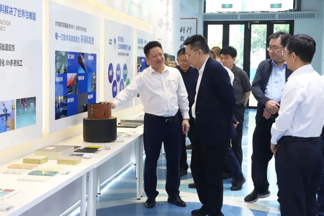 中珀新材董事長鄧強在產品展廳向姜帆董事長一行詳細介紹中珀新材的發展歷程、技術路線、創新成果、產品矩陣及市場前景等情況,并引導參觀了研發技術中心。